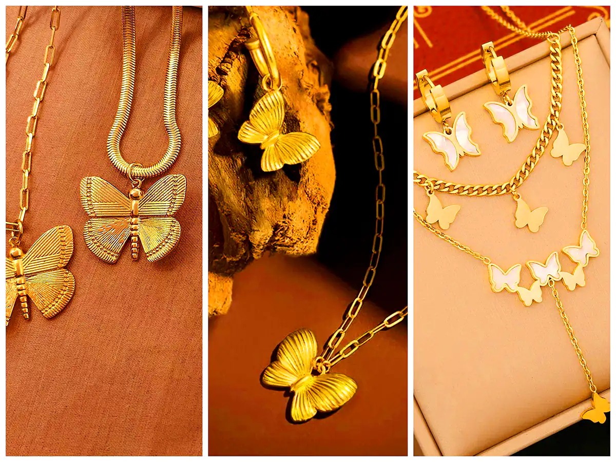 گردنبندهای پروانه‌ای یکی از محبوب‌ترین اقلام در دسته‌بندی طلای لاکچری محسوب می‌شوند. این گردنبندها به دلیل طراحی ساده و در عین حال مدرن، هم برای استفاده روزانه و هم برای مناسبت‌های خاص مناسب هستند. طرح‌های پروانه‌ای اغلب با جزئیات دقیق و درخشش خاصی ساخته می‌شوند که همواره چشم‌ها را به خود جلب می‌کنند. در برخی مدل‌ها، استفاده از سنگ‌های قیمتی کوچک نیز جلوه‌ای لوکس‌تر به این طرح‌ها می‌بخشد.